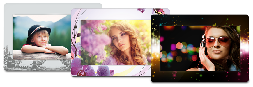 Новинка воплощена в трех вариациях корпуса. На выбор пользователя фоторамка в нежных сиреневых тонах с орхидеями, более строгий вариант с китайскими мотивами и рамка, выдержанная в стилистике диско.